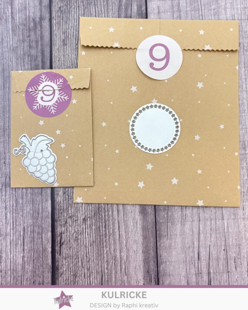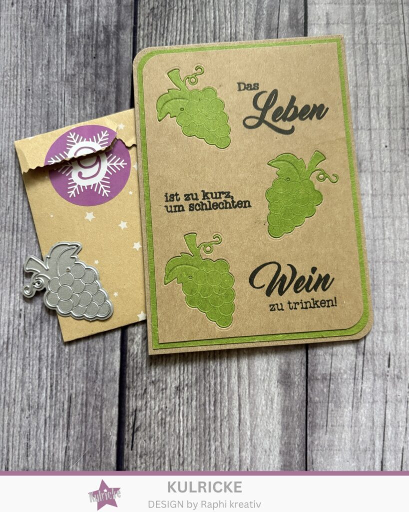 Für die Grundkarte habe ich Cardstock in Recycling Natur gewählt, darauf folgt ein Aufleger aus Cardstock in Kraft Grün. Aus dem obersten Aufleger habe ich die Weintraube aus dem Stanzen-Kalender ausgestanzt und Stanzteile in Kraft Grün eingesetzt. Der Schriftzug stammt aus dem Kulricke-Adventskalender 2022. Für die Optik habe ich vor dem Verkleben bei Grundkarte und Auflegern jeweils 2 Ecken abgerundet.
