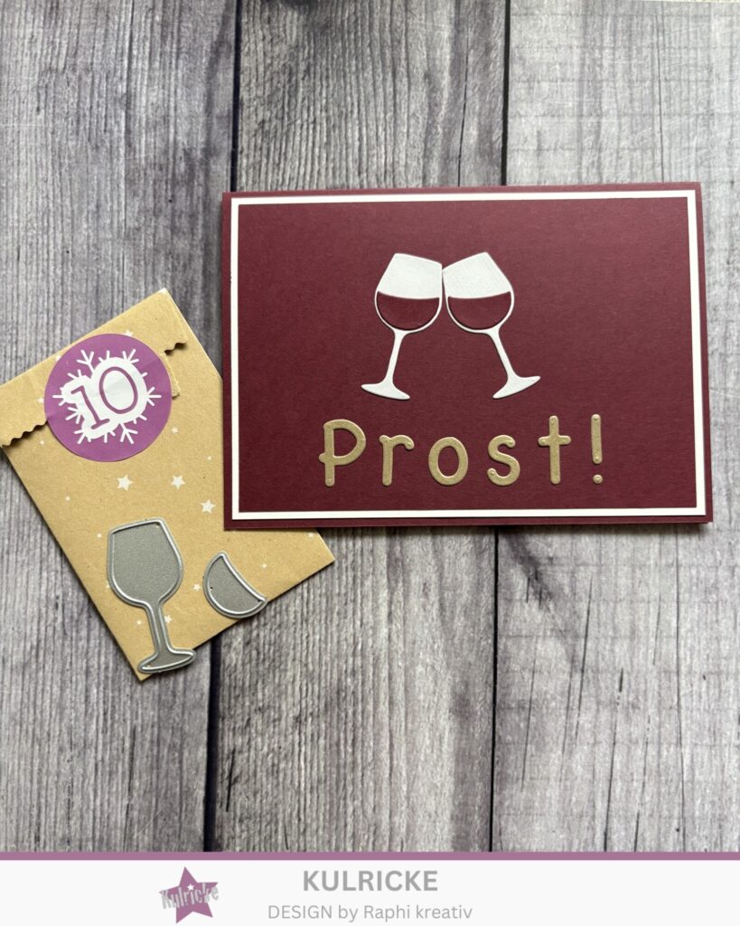 Für die Grundkarte habe ich Cardstock in Waldbeere gewählt, darauf folgt ein Aufleger aus Cardstock in Elfenbein und nochmal ein Aufleger aus Cardstock in Waldbeere. Für die Weingläser aus dem Stanzen-Kalender habe ich Cardstock in Waldbeere und Struktur Puderblau ausgestanzt. Die Buchstaben (Großbuchstaben & Kleinbuchstaben) für den Schriftzug habe ich aus Cardstock in Metallic Coffee ausgestanzt.