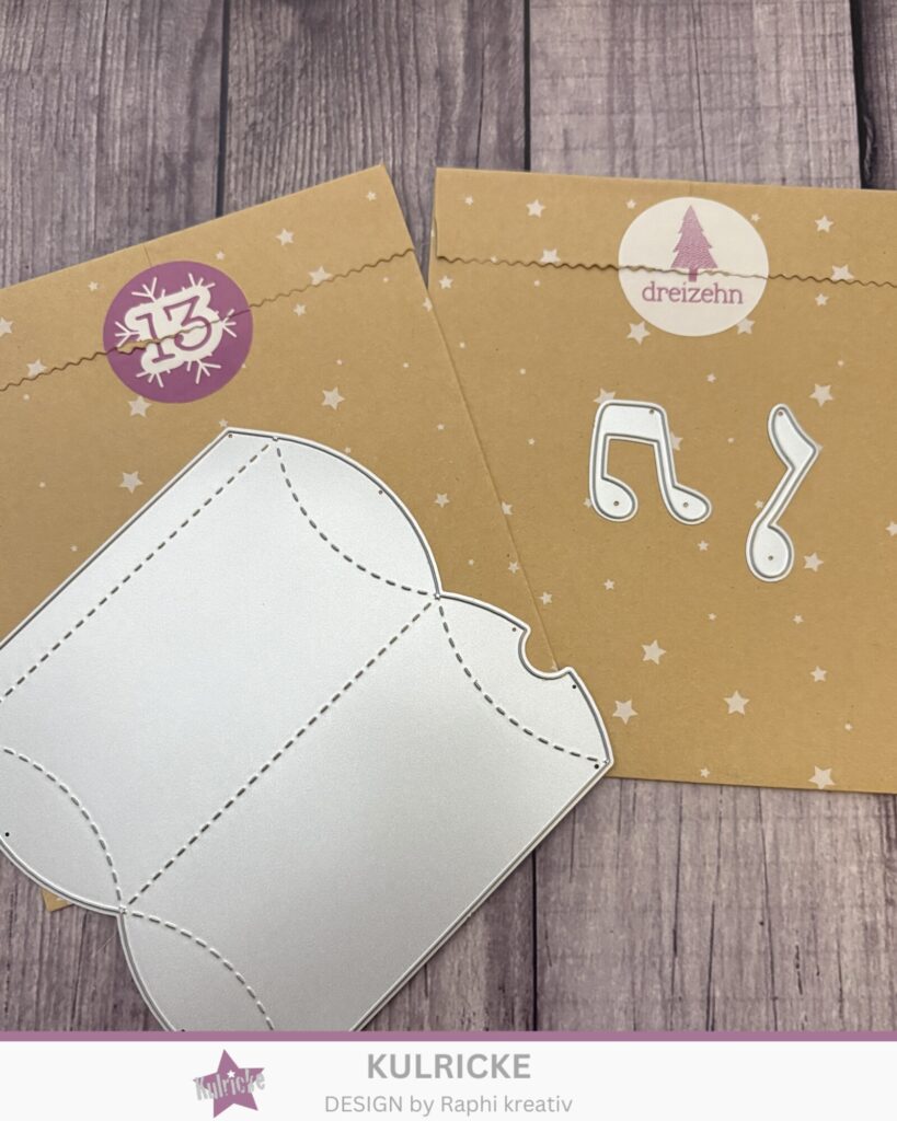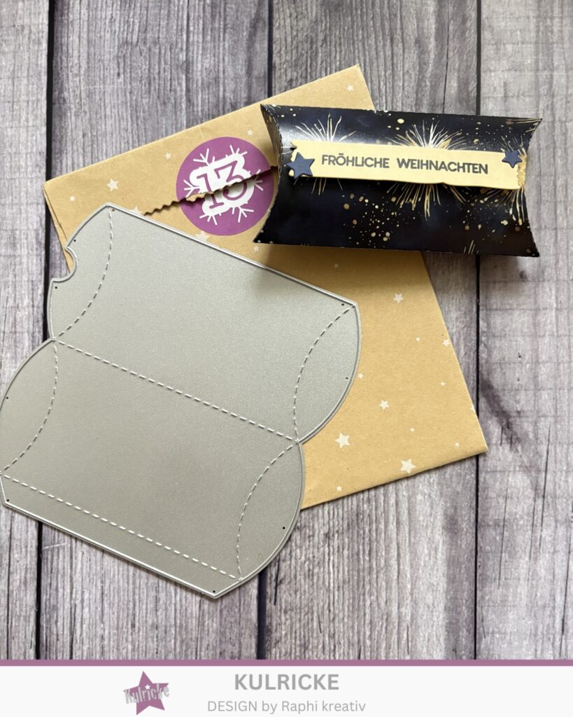 Die Stanzschablone aus dem Stanzen-Kalender habe ich aus einem Bogen Designpapier „Funkelnde Winternächte“ ausgestanzt. Das Banner habe ich aus Cardstock in Cappuccino ausgestanzt und mit einem Schriftzug aus dem Kulricke-Set „Frohes Fest Reverse“ bestempelt. Aus Cardstock in Nachtblau habe ich Sterne ausgestanzt und aufgeklebt.