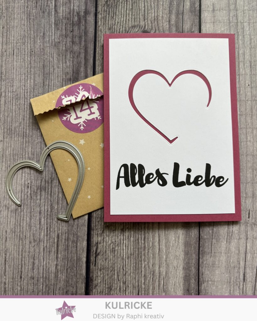 Für die Grundkarte habe ich Cardstock in Himbeere gewählt. In den Aufleger aus Cardstock in Weiß habe ich das Herz aus dem Stanzen-Adventskalender ausgestanzt. Zum Schluss habe ich im unteren Bereich den Schriftzug aus dem Kulricke-Set „Alles Liebe“ gestempelt.