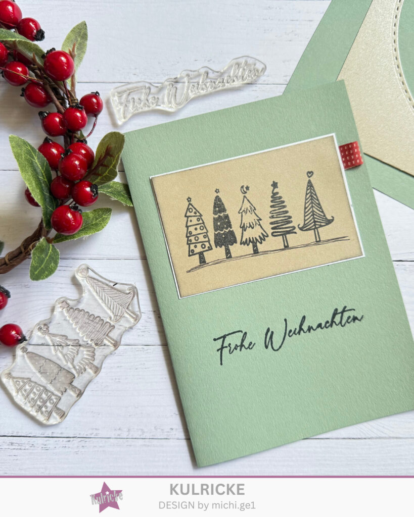 Das braune Papier zuschneiden und so auf weißes Papier kleben, dass ein kleiner Rand zu sehen ist. (Siehe Foto) Nun auf die grüne Klappkarte kleben und noch „Frohe Weihnachten“ auf die Karte stempeln.
