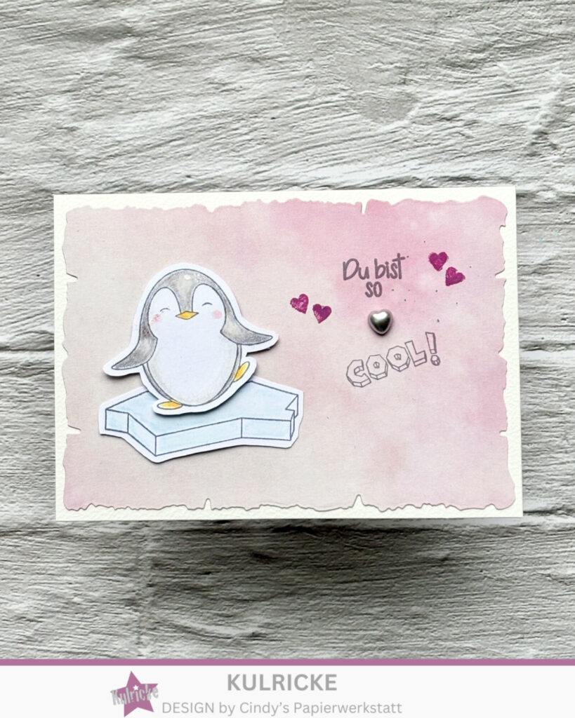 Im Hintergrund ist eines der zauberhaften Papiere aus dem LaCreativ – Designpapier „Pastellzauber“ Paper Pack 6×6″ in Kombination mit „Aufleger-Büttenrand A6“ Stanze gelandet. Komplett wird die Karte mit Spruch und Motiv aus dem Set So Cool. Die Herzen aus Kulricke Stempelset „Pinguin Freunde“ und Enanmel Dot machen die Karte komplett.