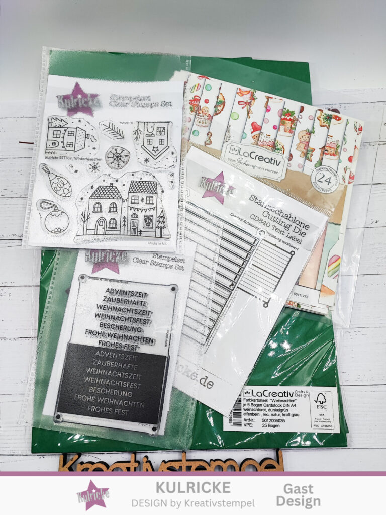 Anschließend die Falzlinien nachfalten und zu einer Taschen zusammen drücken. Verschlossen habe ich die Tasche mit einem Schleifenband. Die Vorder- und Rückseite wird mit dem Designerpapier Lebkuchenschmaus verziert . Anschließend mit dem schönen Stempelset Winterhäuschen auf schwarzem Farbkarton ein Motiv in Weiß stempeln, entsprechend für die Größe zuschneiden und mit einem Spruch (Stempelset Weihnachtslabel und Stanzformen Text Label) versehen.