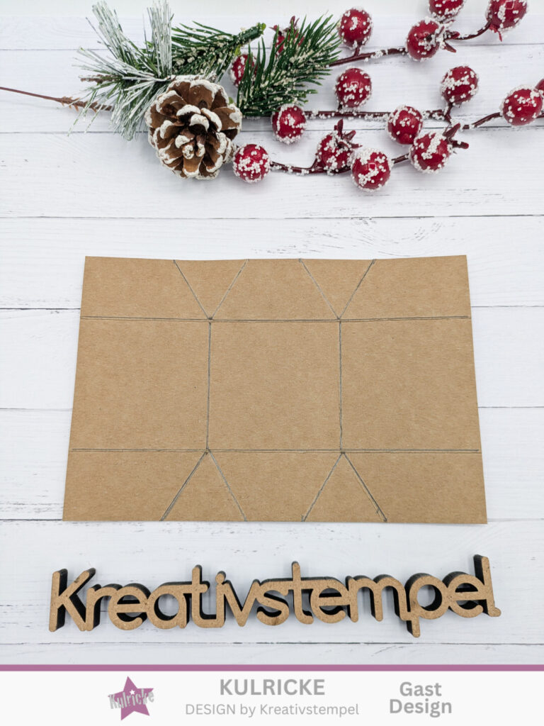 Das Papier muss immer in der gleichen Art und Weise gefalzt werden. Beim großen setzt ihr die Markierungen wie in meinem Video Tutorial beschrieben. Das findet ihr hier weiter unten im Beitrag. Für die kleine Schachtel an den Falzlinien bei 5 + 10 cm und an den Rändern oben und unten bei 3,5 + 6,5 + 8,5 und 11,5 cm eine Markierung setzen. Dann wie auf dem Foto mit Falzlinien verbinden. Schaut unbedingt meine Video Anleitung bei YouTube dazu an.