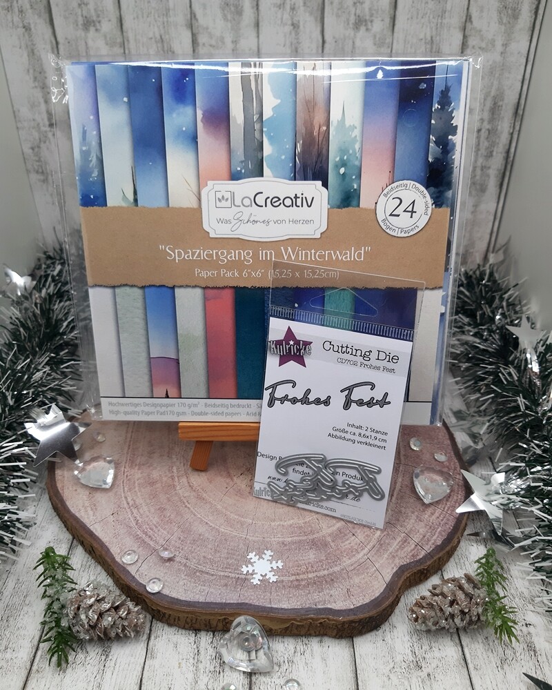 Zu Gewinnen gibt es das Designpapier „Spaziergang im Winterwald“ von La Creativ und die Stanzschablone „Frohes Fest“ von Kulricke.