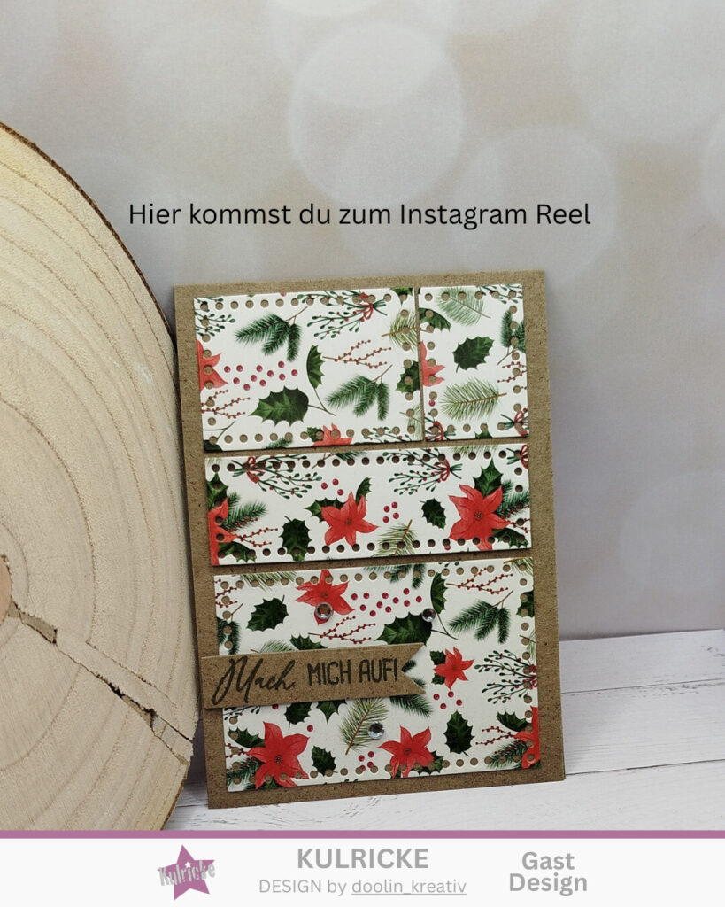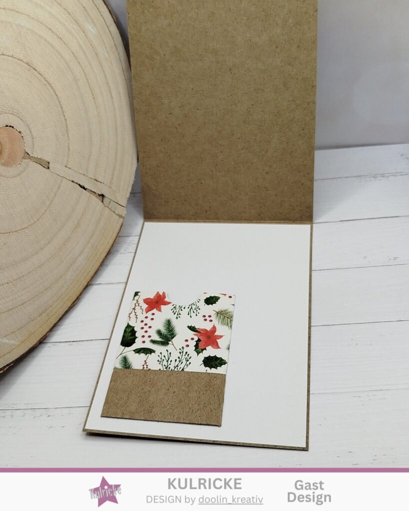 Heute möchte ich euch eine Gutscheinkarte zeigen. Außen auf der Karte habe ich das Papier ausgestanzt und in verschiedene Höhen aufgeklebt. Man kann Abstandspads nehmen oder Restepapier darunter kleben. Im Inneren der Karte habe ich aus einem Rechteck eine Gutscheintasche gebastelt. Ein Rechteck zuschneid und an den zwei langen Seiten und an einer kurzen Seite falzen, danach die Falzkreuze (Quadrate) rausschneiden und aufkleben. Ich habe noch mit einem Punchboard die Eingrifflasche gestanzt, dass geht mit der Schere aber auch. Wenn man nur noch kleine Restpapier hat, kann man zwei Papiere überlappend zusammen kleben.