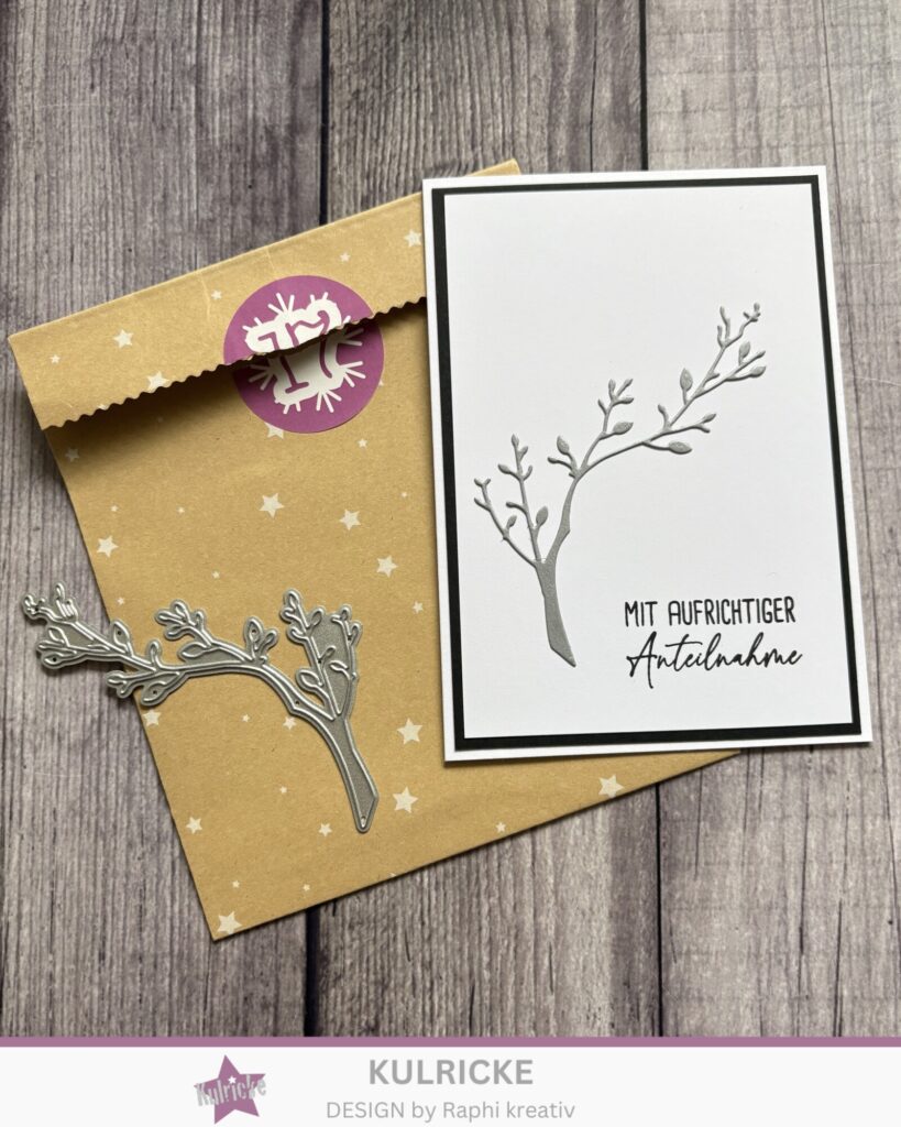 Für die Grundkarte habe ich Cardstock in Weiß gewählt. Darauf folgt ein Aufleger aus Cardstock in Schwarz. Den obersten Aufleger aus Cardstock in Weiß habe ich mit einem Schriftzug aus dem Kulricke-Set „In stillem Gedenken“. Den Baum aus dem Stanzen-Kalender habe ich aus Cardstock in Metallic Platin ausgestanzt und aufgeklebt.