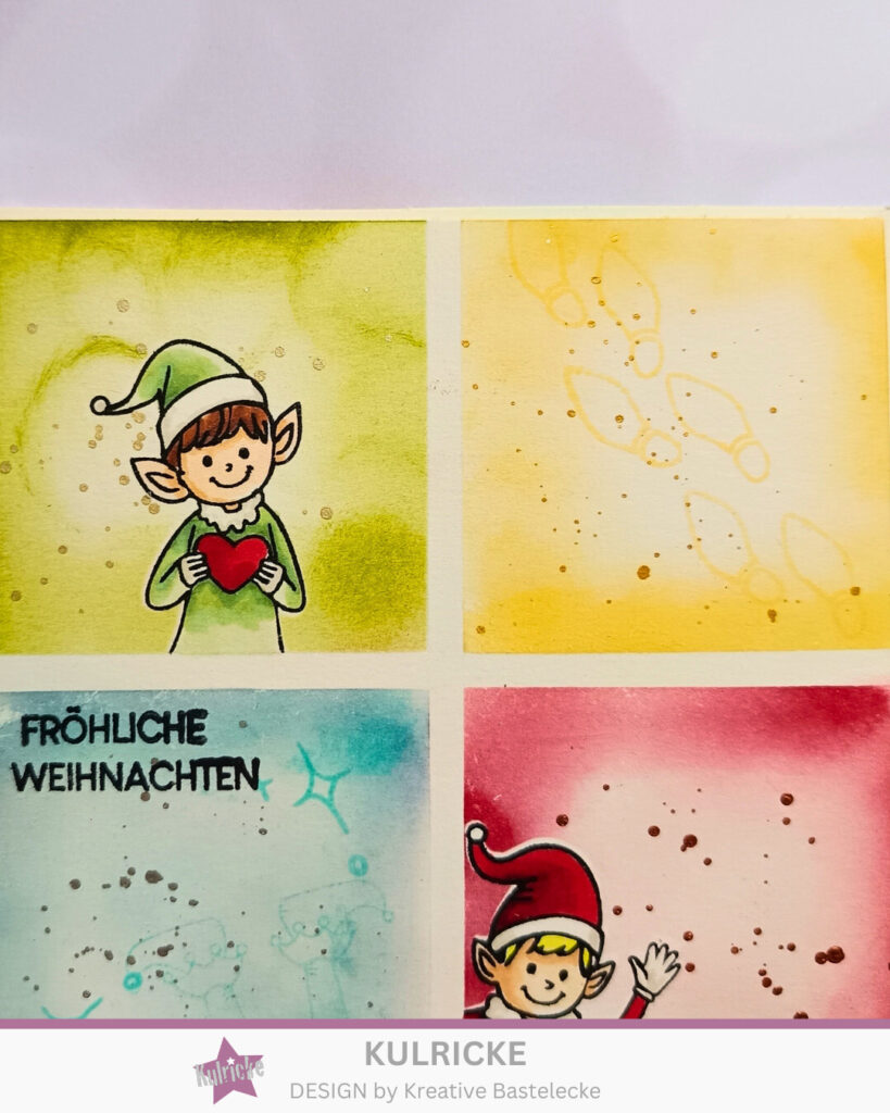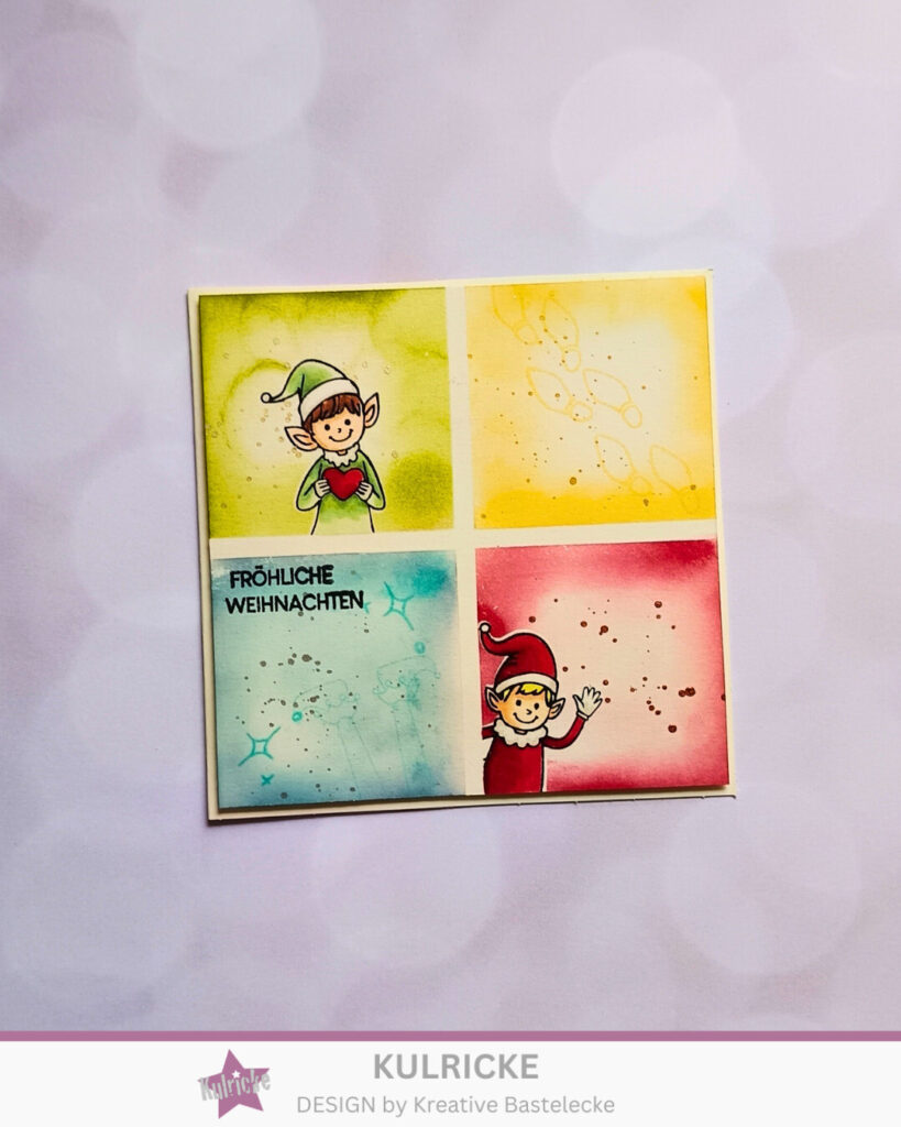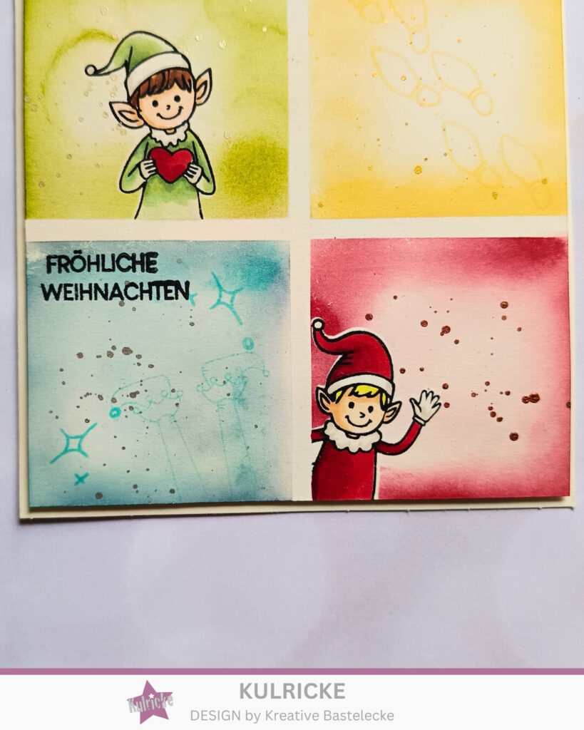 Im unteren Teil habe ich den anderen Elfen verwendet, die Sternchen und die Beinchen des Elfen. Ein Spruch musste natürlich auch darauf, welches ich vom Set Frohes Fest Reverse. Fertig ist die Karte – sie ist ein wenig aufwändiger, aber ich finde sie echt mega toll.