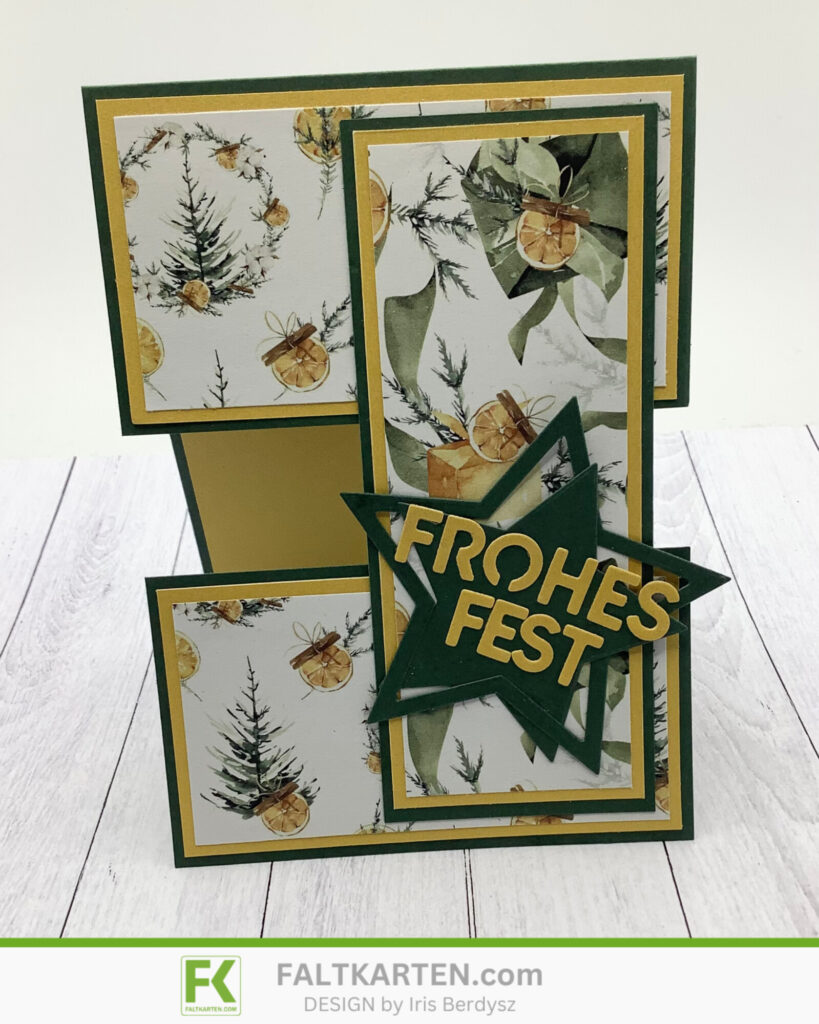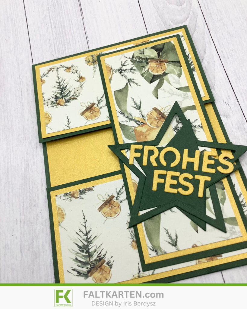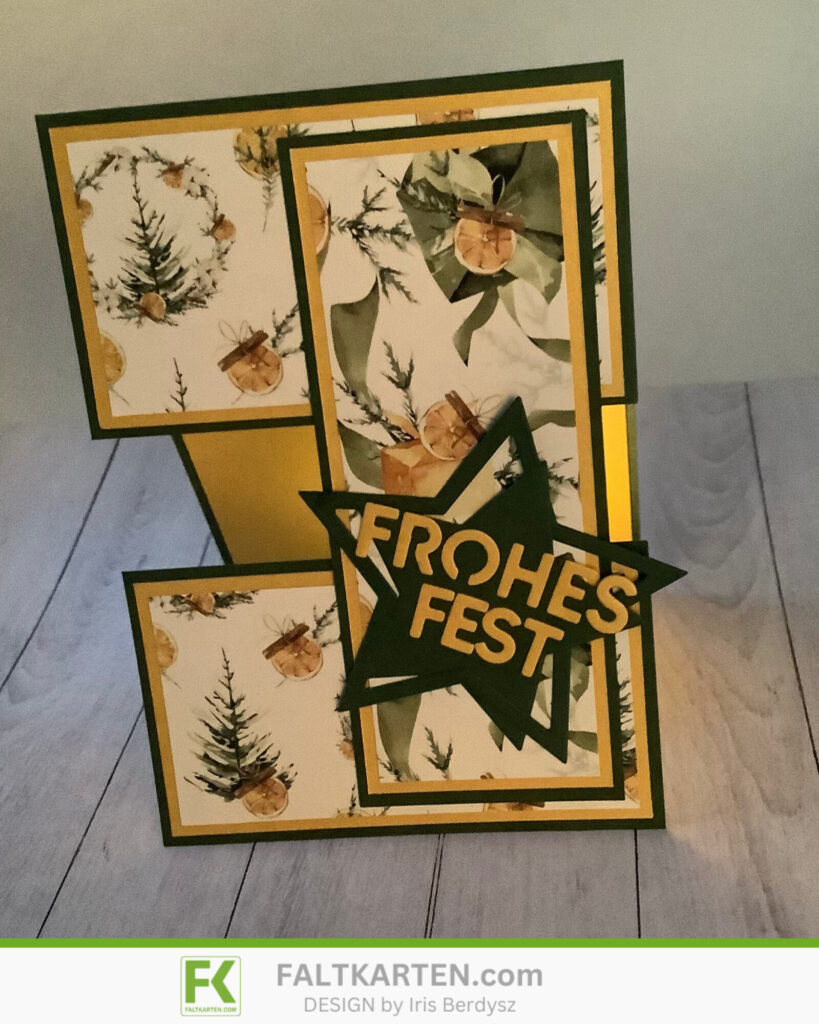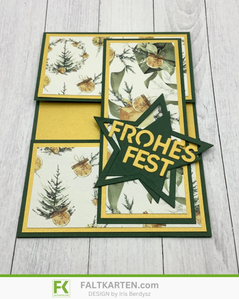 Als nächstes stanzte ich den Stern aus dem Kulricke Set Rahmen Sterne aus, klebte beide Teile versetzt aufeinander und stanzte danach das Frohes Fest aus, das ich auf den Stern klebte, den ich wiederum auf die längliche Lasche klebte.
