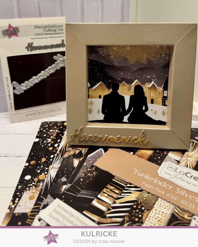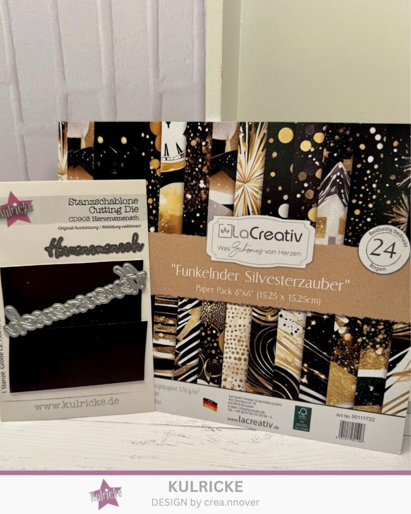 Zu Gewinnen gibt es das LaCreativ – Designpapier „Funkelnder Silvesterzauber“ und die Stanzschablone „Herzensmensch“ von Kulricke.