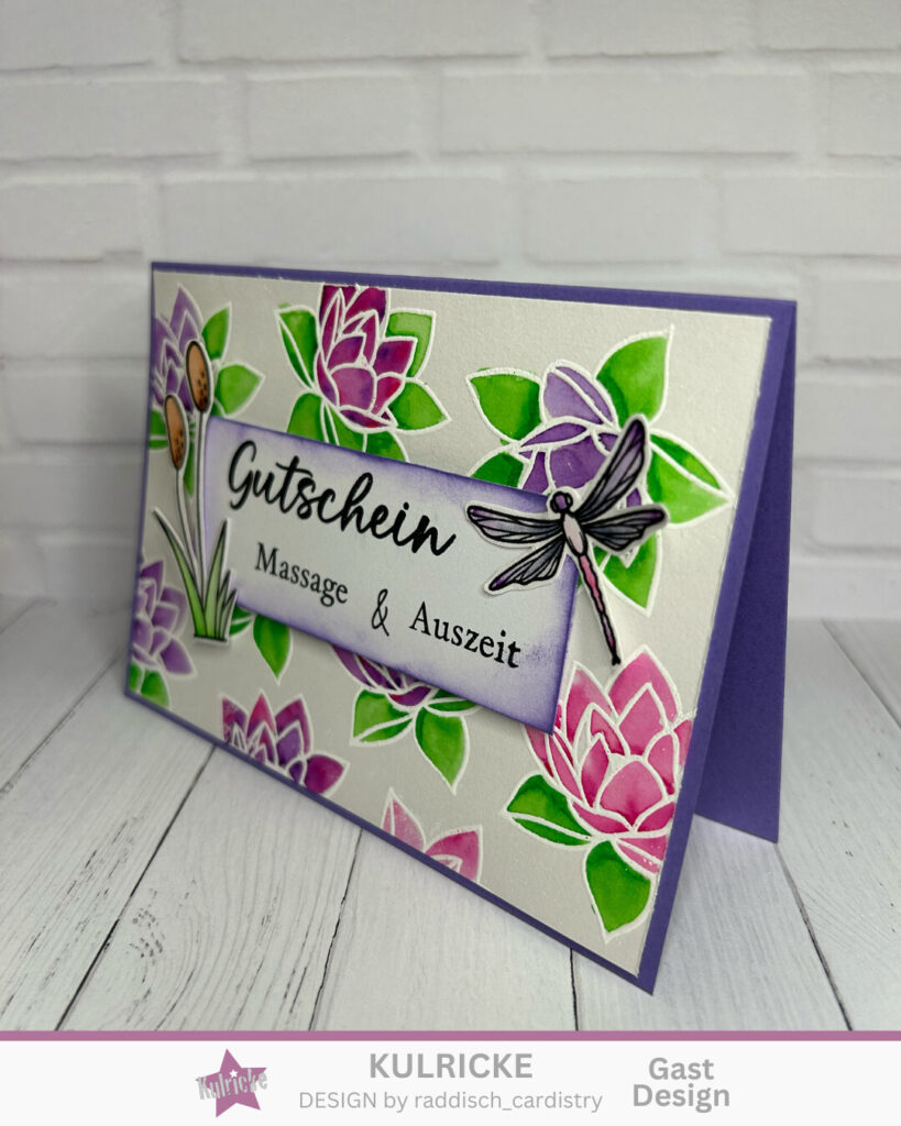 Diese Karte macht es leicht, etwas wirklich Wertvolles zu schenken. Dabei treffen Seerosen auf einen Gutschein für Massage und Auszeit – die perfekte Kombination für gemeinsame Zeit.