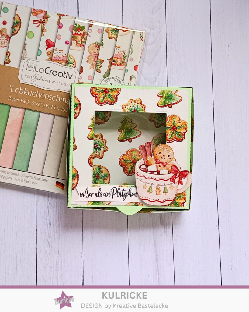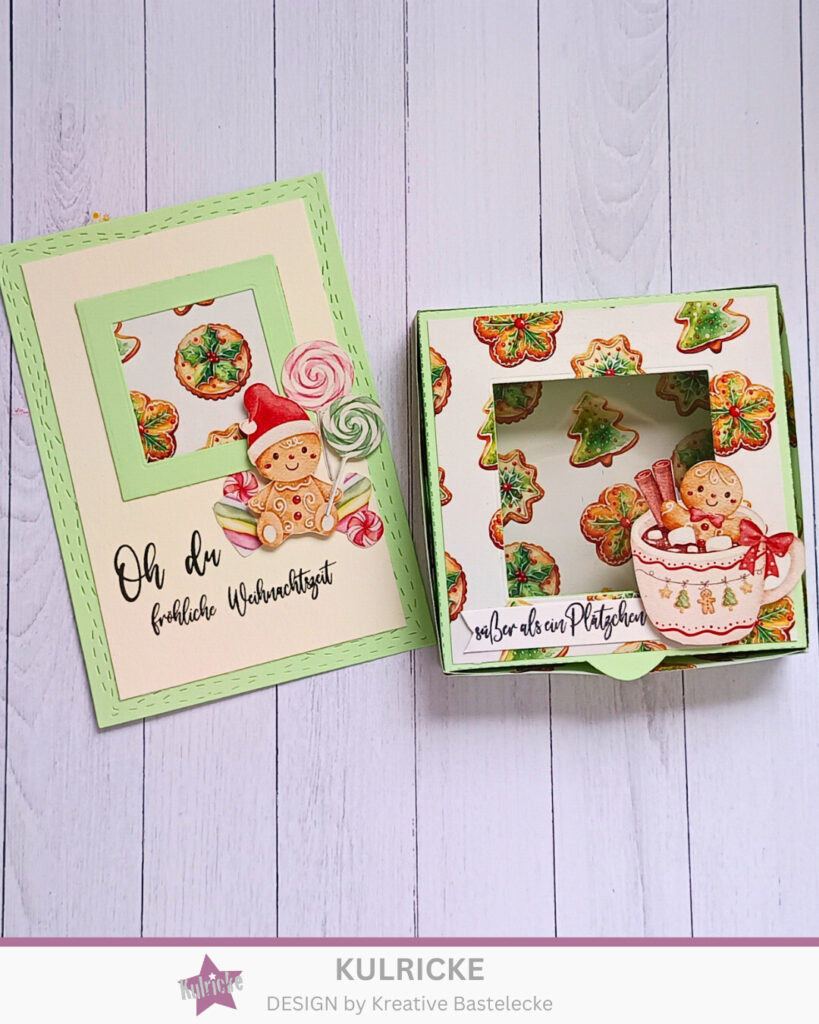 Und zwar gibt es ein Set von mir, mit dem Designpapier Lebkuchenschmaus. Hierbei habe ich einmal eine Karte gewerkelt und eine passende Box dazu. Das Set zusammen lässt sich wunderbar verschenken.