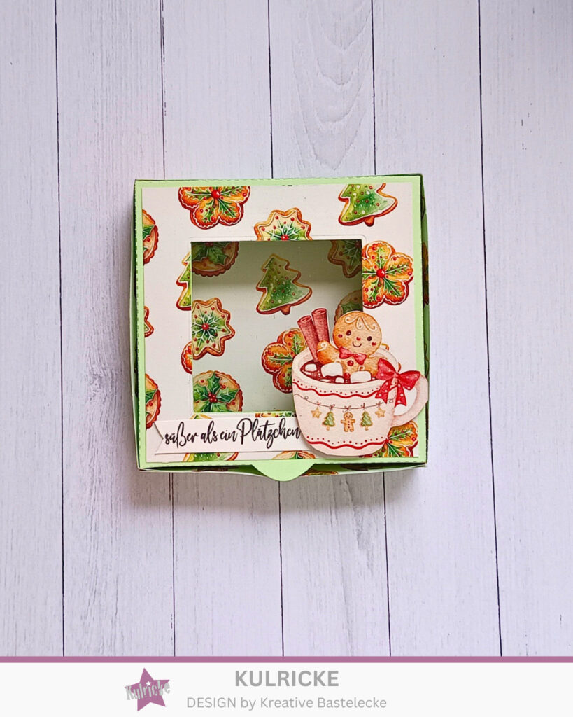 Das Motivpapier habe ich ebenfalls zurechtgeschnitten und aufgeklebt. Das Lebkuchen Männchen in der Tasse platziert und den Spruch aus dem Set Oh du Fröhliche wieder verwendet. Fertig ist das Set – wie gefällt es euch?
