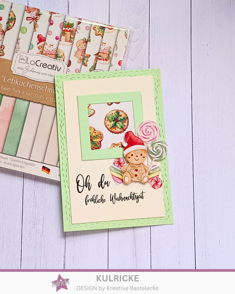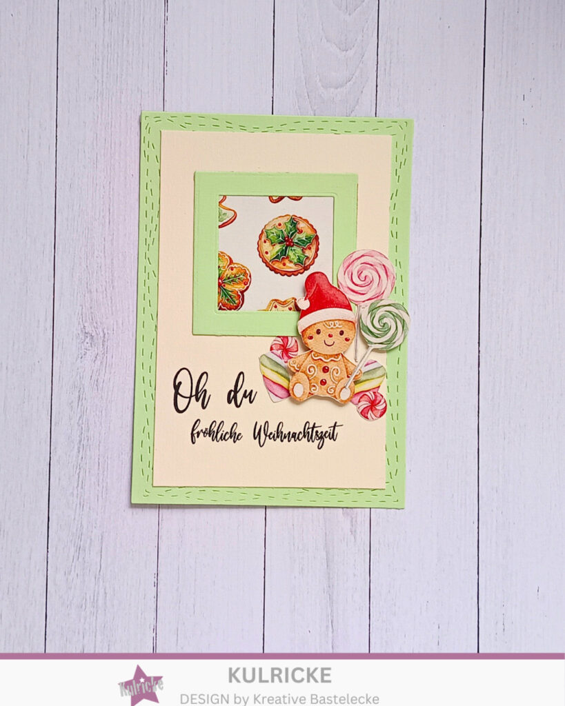 Die Karte habe ich einen Salbeigrünen Cardstock hergenommen (dieser war auch meinem Bastelfundus noch) Ich habe dafür die Stanze Aufleger Din A6 Karte verwendet. Darauf ein beigen Cardstock drauf geklebt. Aus dem Desginpapier habe ich den süßen Lebkuchenmann und die Süßigkeiten ausgeschnitten.