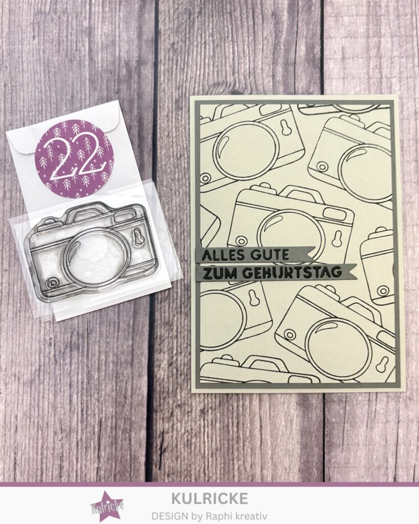 Für die Grundkarte habe ich Cardstock in Hellgrau gewählt, darauf folgt ein Aufleger aus Cardstock in Steingrau. Den obersten Aufleger aus Cardstock in Hellgrau habe ich mit der Kamera bestempelt. Die Fähnchen habe ich aus Cardstock in Steingrau und Schwarz ausgestanzt und aufgeklebt.