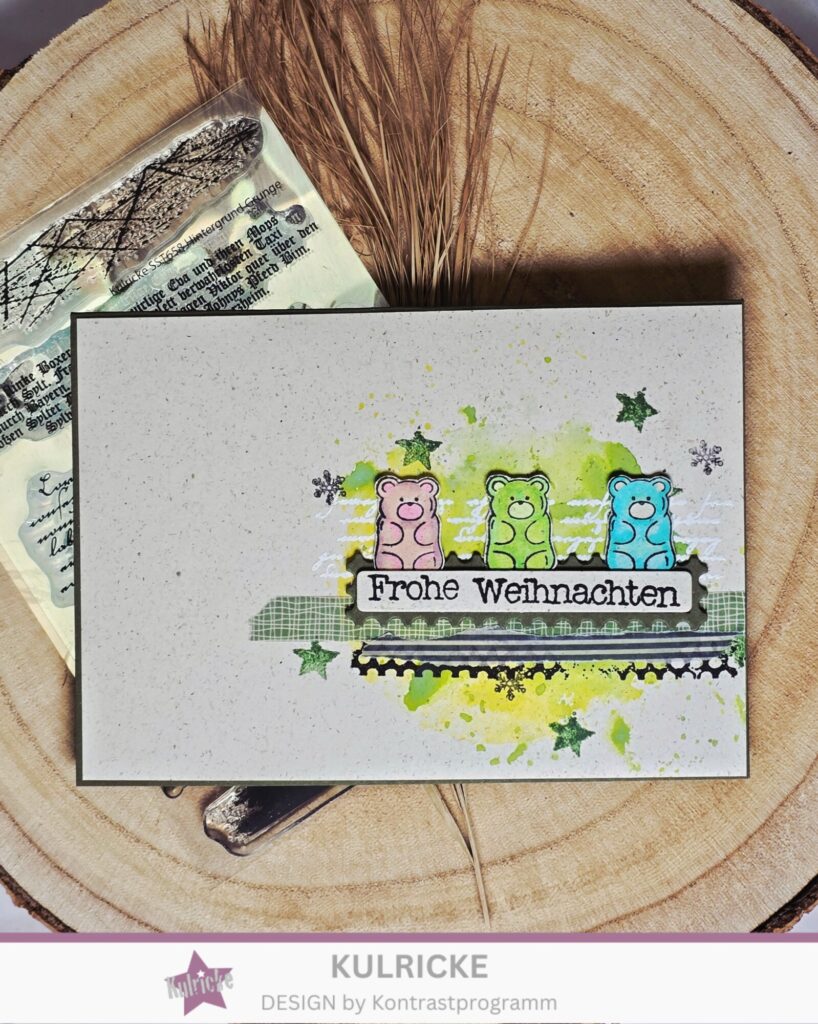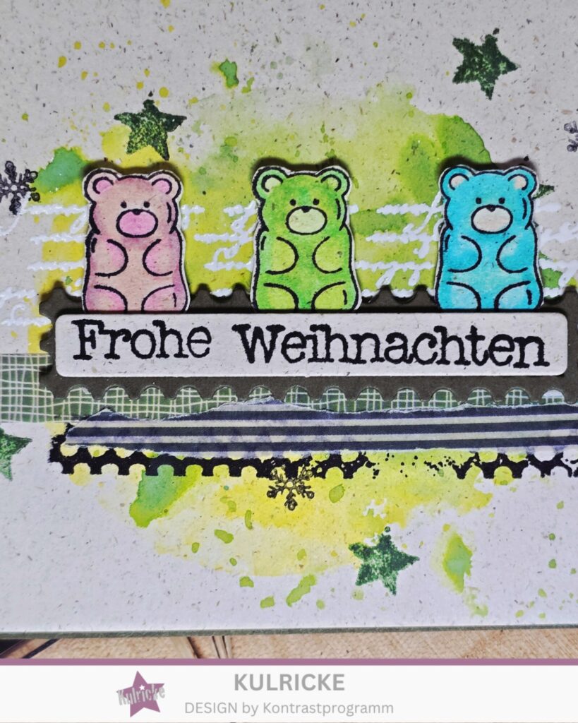 Ach wie niedlich, Gummiweihnachtsbärchen ♥. Und die Hintergrundstempel sind auch schön.