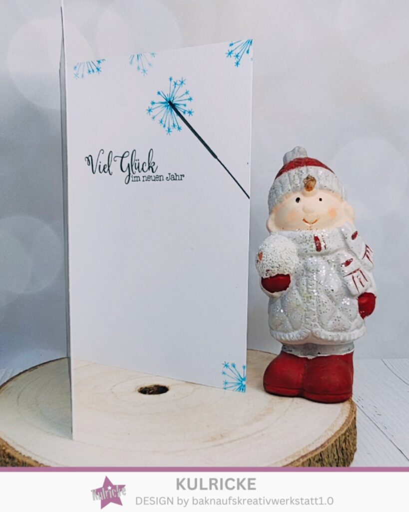 Grundkarte in weiß, darauf ein Aufleger vom DSP 10×14 cm. In die Karte ein Silvester Spruch und ein paar Funken Feuerwerk. Fertig ist die schnelle Karte.