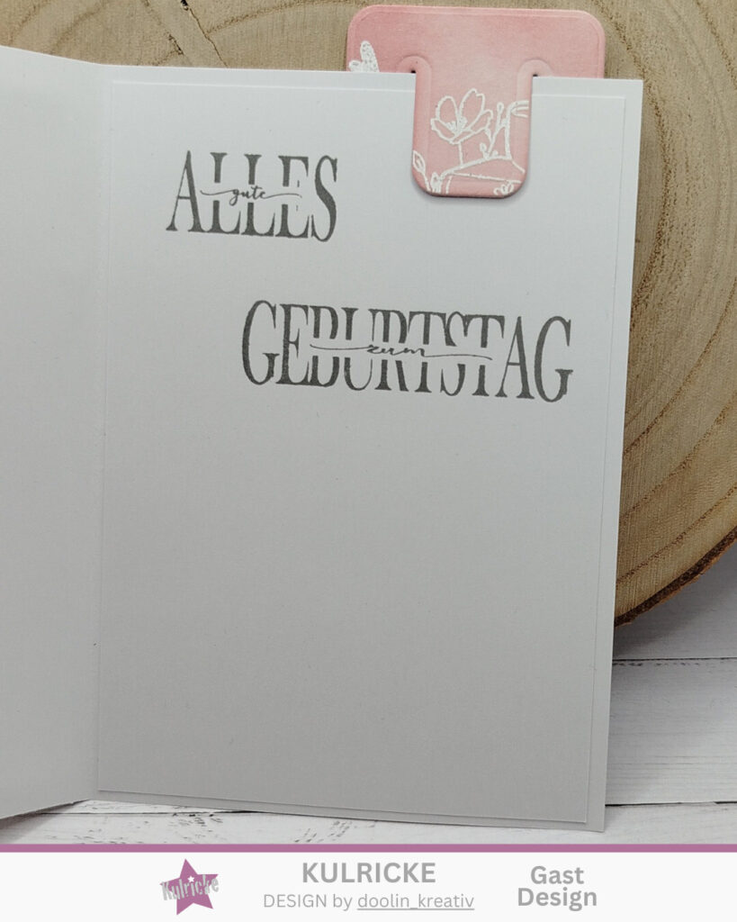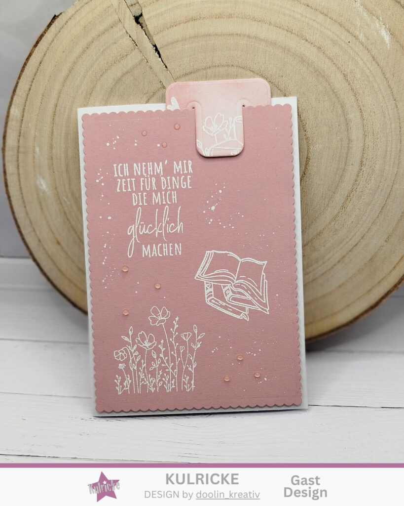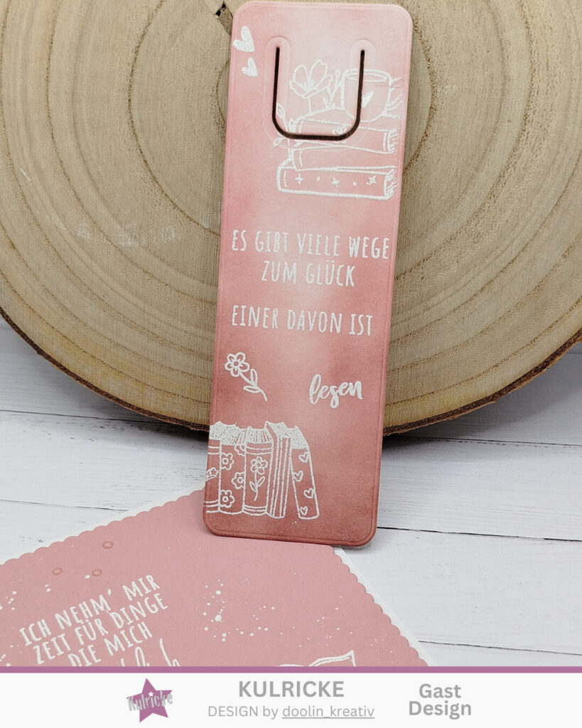 Bei dieser Bastelei habe ich mich für gedeckte Farben entschieden. Das Lesezeichen habe ich mit Distress Oxide gewischt. Für das erste Mal bin ich zufrieden. Nach dem wischen, habe ich die Stempelabdrücke weiß embosst. Im Moment kommt bei mir keine Projekt oder Embossing aus. Den Karten Aufleger habe ich erhöht mit Klebpads aufgeklebt und die Breit für das Lesezeichen freigelassen. So kann ich das Lesezeichen besonders verschenken. Im Inneren der Karte habe ich dann noch grau gestempelt. Den Aufleger habe ich noch mit den Wellenrand Aufleger Stanze ausgestanzt.