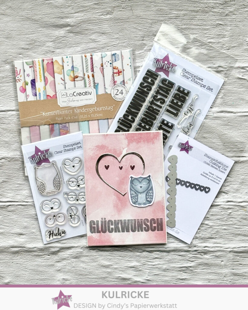 Als Aufleger habe ich die Stanze aus dem Stanzen-Kalender vom letzten Jahr genutzt in Kombination mit dem tollen LaCreativ – Designpapier „Kunterbunter Kindergeburtstag“ Darauf ist zu finden Kulricke Stempelset „Huhu Uhu“, dieses Set bietet vielfältige Gestaltungsmöglichkeiten, richtig klasse! Das große offene Herz ist ebenso aus dem Stanzen Kalender vom letzten Jahr. Für die kleinen Herzen habe ich Kulricke Stanzschablone „Herzen Insert“ verwendet (Achtung akt. im Sale!). Komplett wird die Karte mit einem Text aus Kulricke Stempelset „Alles Gute XL“.