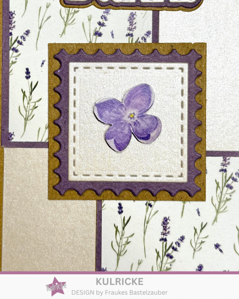 Die Grundkarte hat die Größe 14,8×10,5cm). Der Aufleger ist 8,5×12,5cm. Die Vierecke haben unterschiedliche Grösse (3x5cm, 5x5cm, 5x7cm und 3x7cm) und die Designpapier-4-ecke sind je eine 4mm kleiner. Das kleine Quadrat hat die Maße 5x5cm. Für die Briefmarke habe ich unser neues Stanzenset „Briefmarken- Mix“ verwendet. Die Blume ist auch aus dem Deignpapierset „Lavendelglück“ und mit der Schere ausgeschnitten.