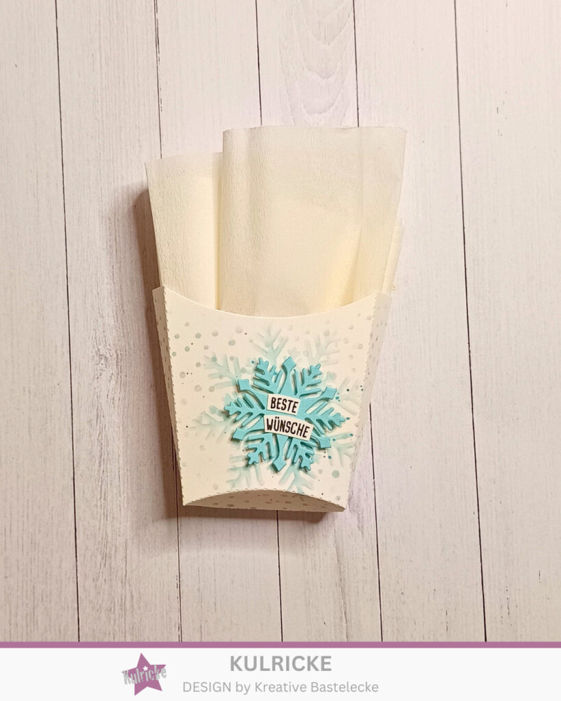 Hierfür habe ich ein Set gemacht aus einer Karte und einer Pommesbox. Ich wollte den Winter damit einfangen und einfach schlichter und eleganter es wirken lassen.