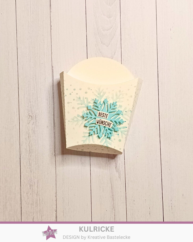 Als nächstes habe ich die Box gemacht. Hierfür habe ich auf den weißen Cardstock genau den gleichen Hintergrund gemacht, wie auf der Karte. Also die Blaue Stempelfarbe und der Stencil Schneeflocken. Zusätzlich habe ich aber auch noch mit einem Grauton und dem Stencil Punkte weitere Highlights im Hintergrund gewischt. Die Box ist die Stanze Pommesbox.