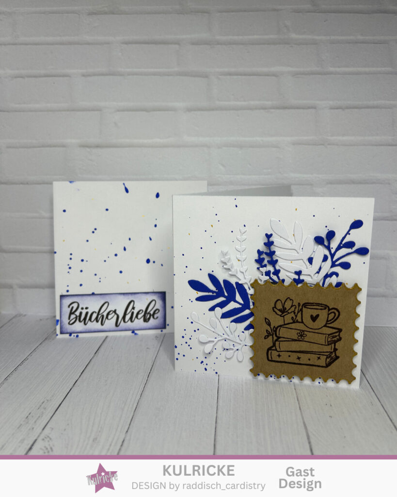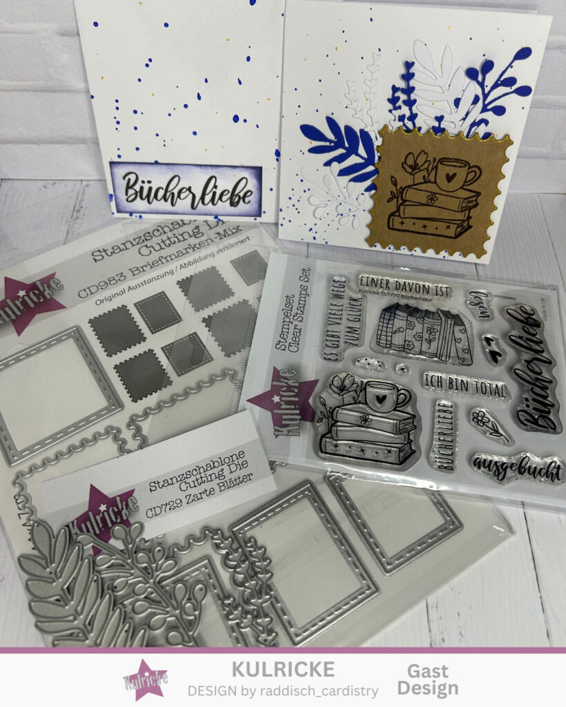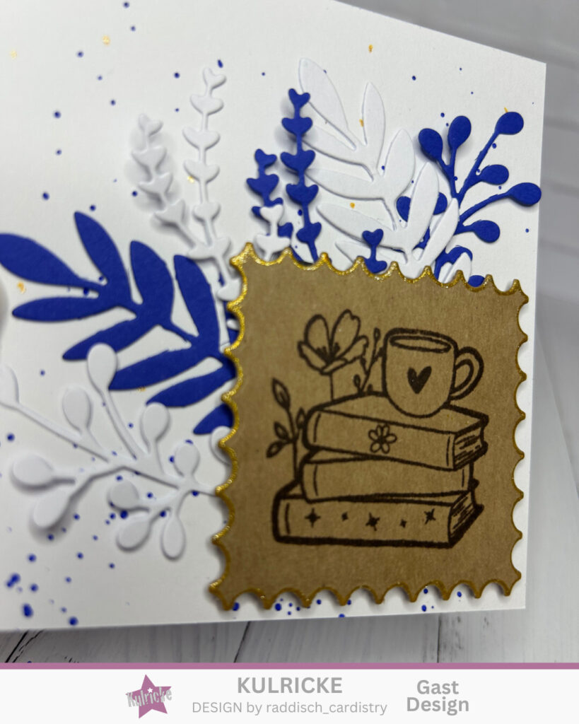 Als erstes habe ich die Deko vorbereitet. Dafür werden mit dem Stanzen-Set „Briefmarken-Mix“ die größte Briefmarke aus dem Kraftpapier ausgestanzt. Zusätzlich habe ich aus weißem und blauem Papier die Zarten Blätter herausgelöst. Dann für den Briefumschlag einfach ein Rechteck in der Größe des Stempels „Bücherliebe“ ausscheiden.