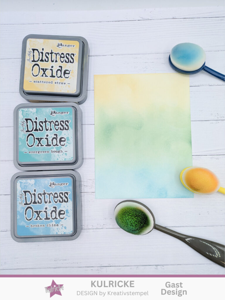 Als erstes schneidet ihr euch einen Aufleger aus weißem Farbkarton in 14,3 x 10 cm zu. Diesen könnt ihr mit Distress Oxide Stempelkissen und Blending Pinseln nach Lust und Laune gestalten.