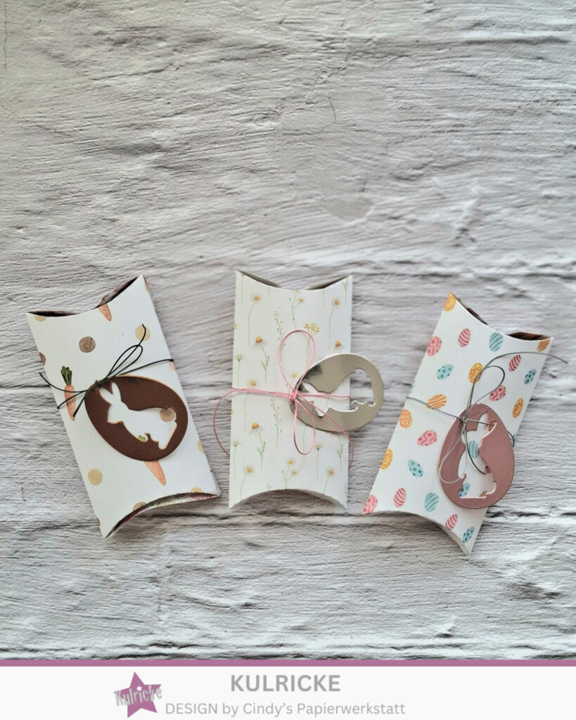 Stanze Pillowbox und Osterhasen Anhänger sind aus dem StanzenAdventskalender vom letzten Jahr, kommen aber zeitnah in den Shop 🙂