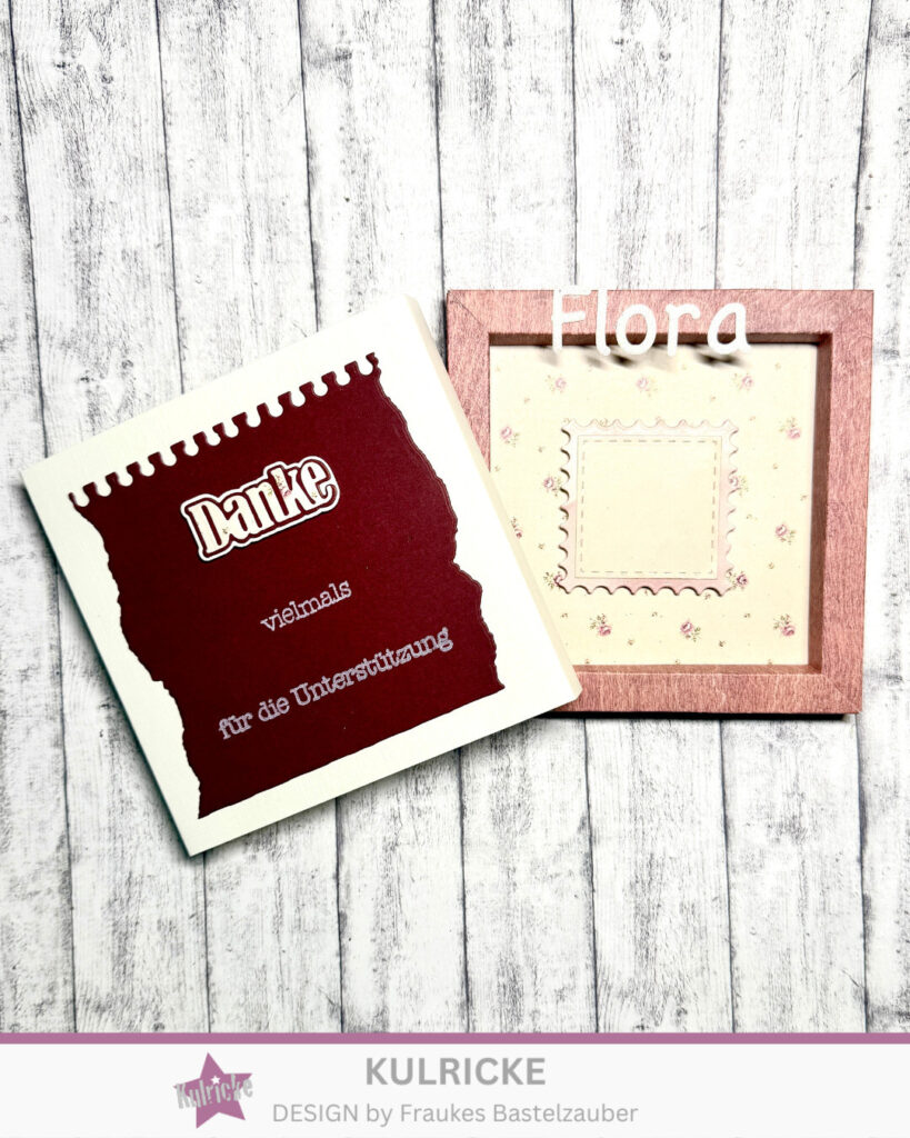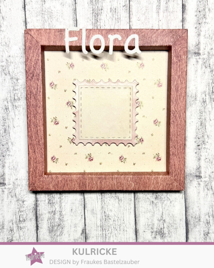Innen habe ich den Namen (mit den Stanzen „ABC- Großbuchstaben“ ausgestanzt) des Babys auf den Rahmen aufgeklebt. In den Rahmen habe ich einen Bogen des Designpapier „Boho- Babyzauber“ geklebt und mit der Stanze „Briefmarken- Mix“ Platz für ein Foto geschaffen.