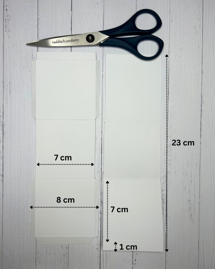An den kurzen Seiten des Streifens, mit den Maßen 23×8 cm, wird beidseitig eine Falzlinie bei 0,5 cm vom Rand über die gesamte Länge gezogen. Dann wird bei beiden Streifen auf der langen Seite bei 1 cm, 8 cm, 15 cm und 22 cm gefalzt.