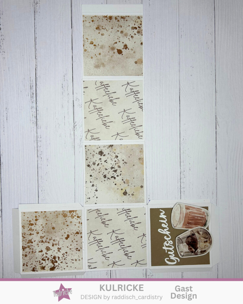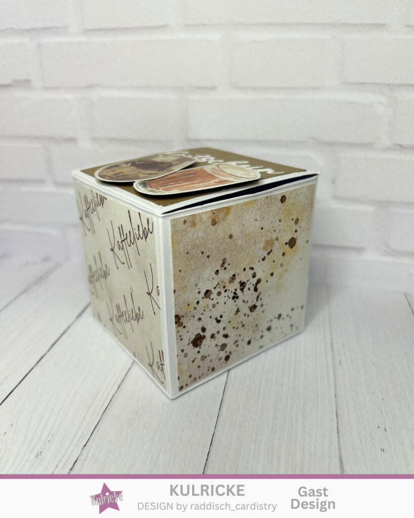 Als letztes nur noch die Box zusammenfalten und die Laschen verkleben und schon habt ihr eine kleine Gutscheinbox, wo man eventuell eine Praline oder ähnliches verstecken kann. Perfekt als Einstimmung für das nächste gemeinsame Kaffee trinken.