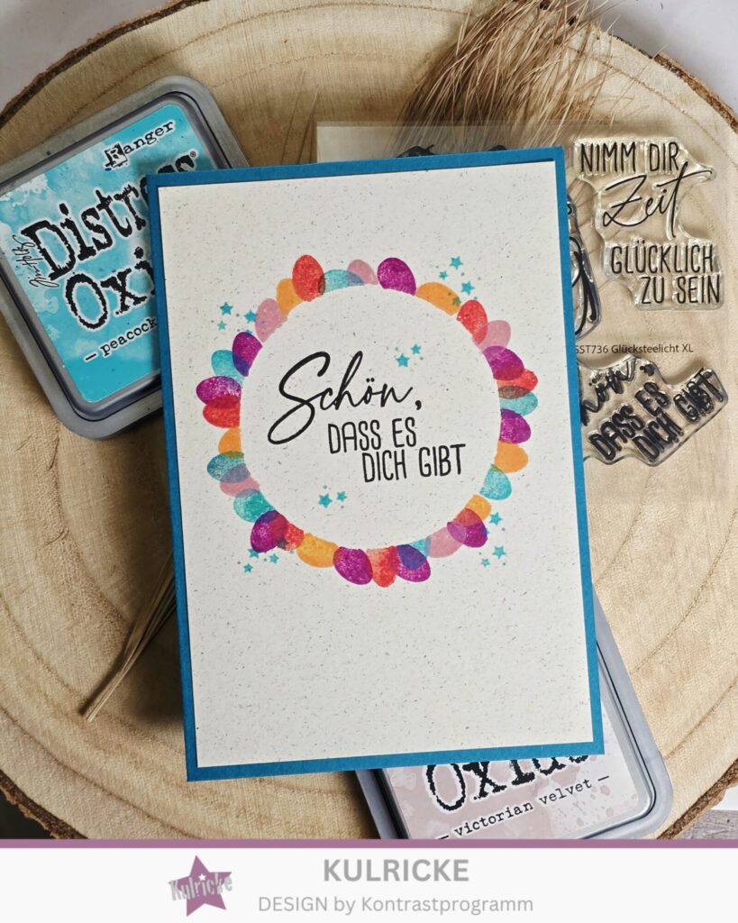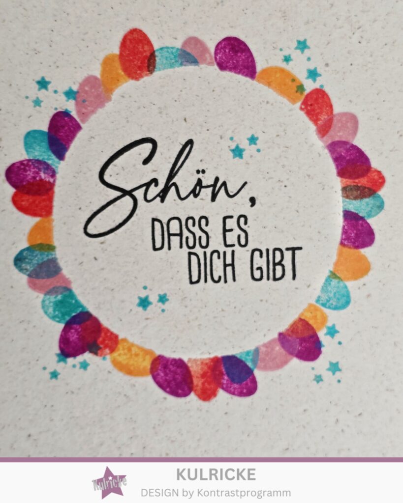 Heute habe ich eine Karte für dich, wo Farbe ins Spiel kommt. Dazu brauchst du nur verschiedene Stempelkissen und einen schönen Schriftzug.