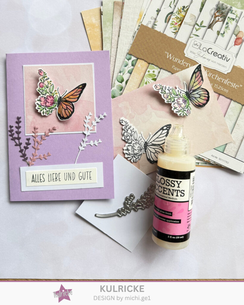 Den Schmetterling colorieren und die rechte Flügelseite mt Glossy Accent einstreichen, damit er etwas schimmert. Mit Abstand-Pads ins Quadrat kleben.