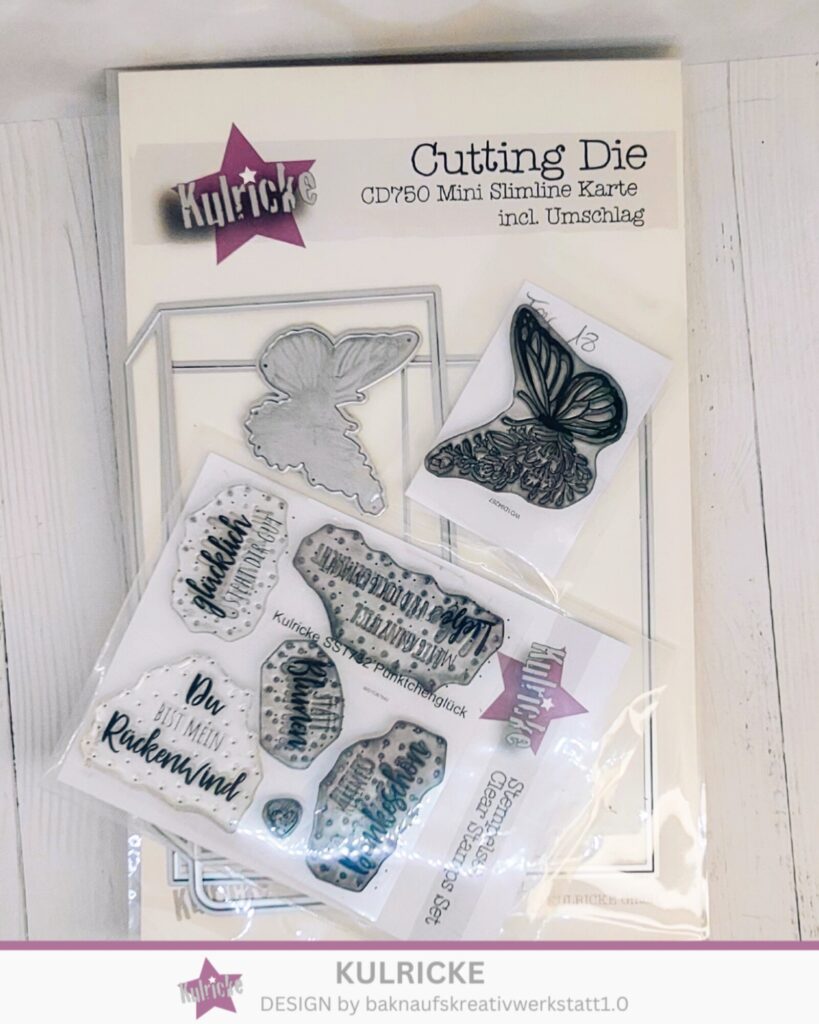 Ihr stanzt euch mit der Slim Line Stanze eure Karte aus. Der Schmetterling ist von mir auf vorher mit Aquarell Farben eingefärbtes Aquarellpapier gestempelt worden und anschließend ausgestanzt (Stempel jetzt im Shop, Stanze aus dem Adventskalender).