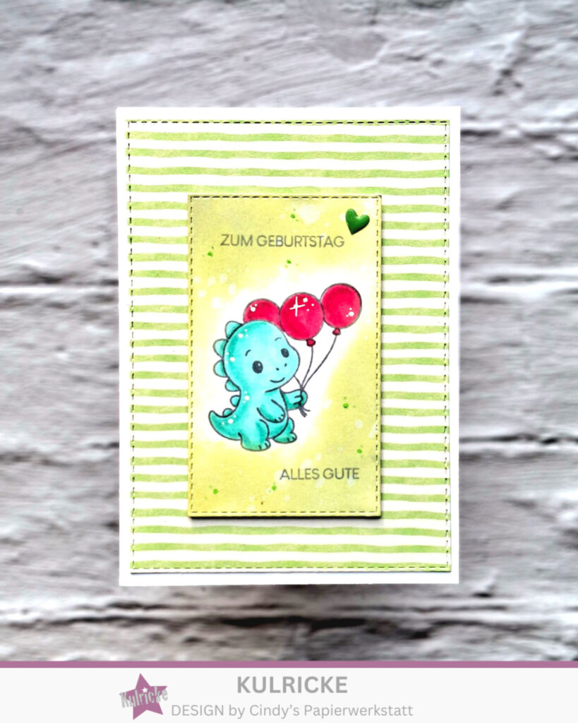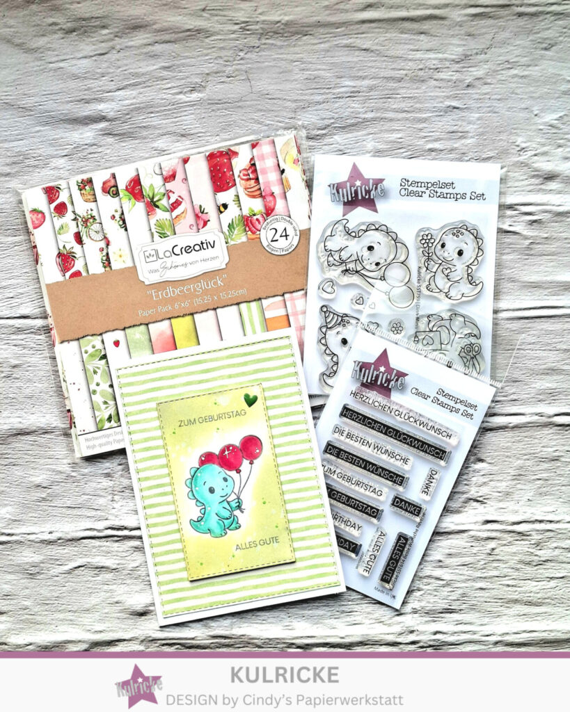 Im Hintergrund habe ich für den größeren Aufleger einen der wunderschönen Bögen aus LaCreativ – Designpapier „Erdbeerglück“ genutzt. Den kleineren habe ich mit Distress Oxide gewischt um dem süßen Kulricke Stempel „Dino-Minis“. Komplett wird die Karte mit einer Textkombi aus einem absoluten Must Have Kulricke Stempelset „Beste Wünsche“