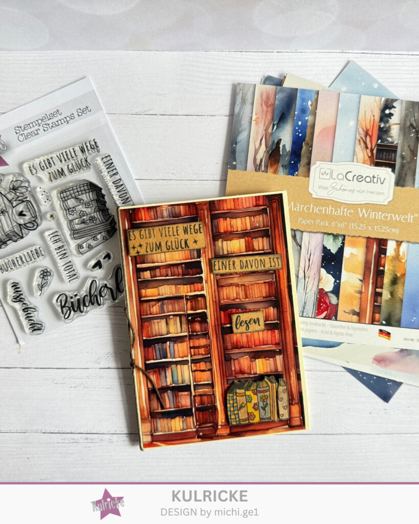 Aus Designpapier das Bücherregal für die Klappkarte passend schneiden und aufkleben.