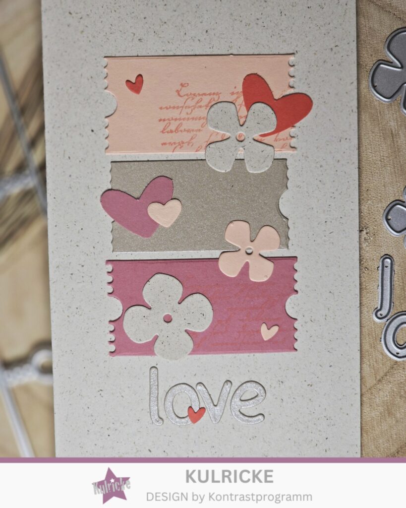 Diesmal habe ich die ABC Kleinbuchstaben -Stanze verwendet. Mit ein paar Herzen aus meinem Bestand und einigen Blumen die ich mit der Stanze Blumen-Set ausgestanzt habe, ist die Karte schon fertig.
