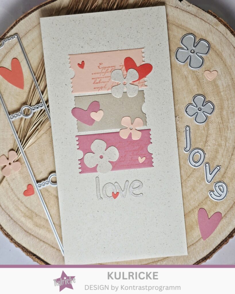 Heute habe ich eine Valelentins-Karte in Din lang mitgebracht. Ich habe mir die Stanze Etiketten-Streifen geschnappt und diese in verschiedenen Farben ausgestanzt und untereinander geklebt. Zwei der Streifen habe ich vorher mit dem Hintergrundstempel Grunge bestempelt.