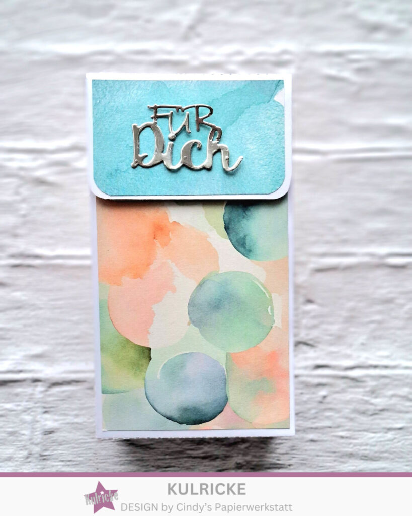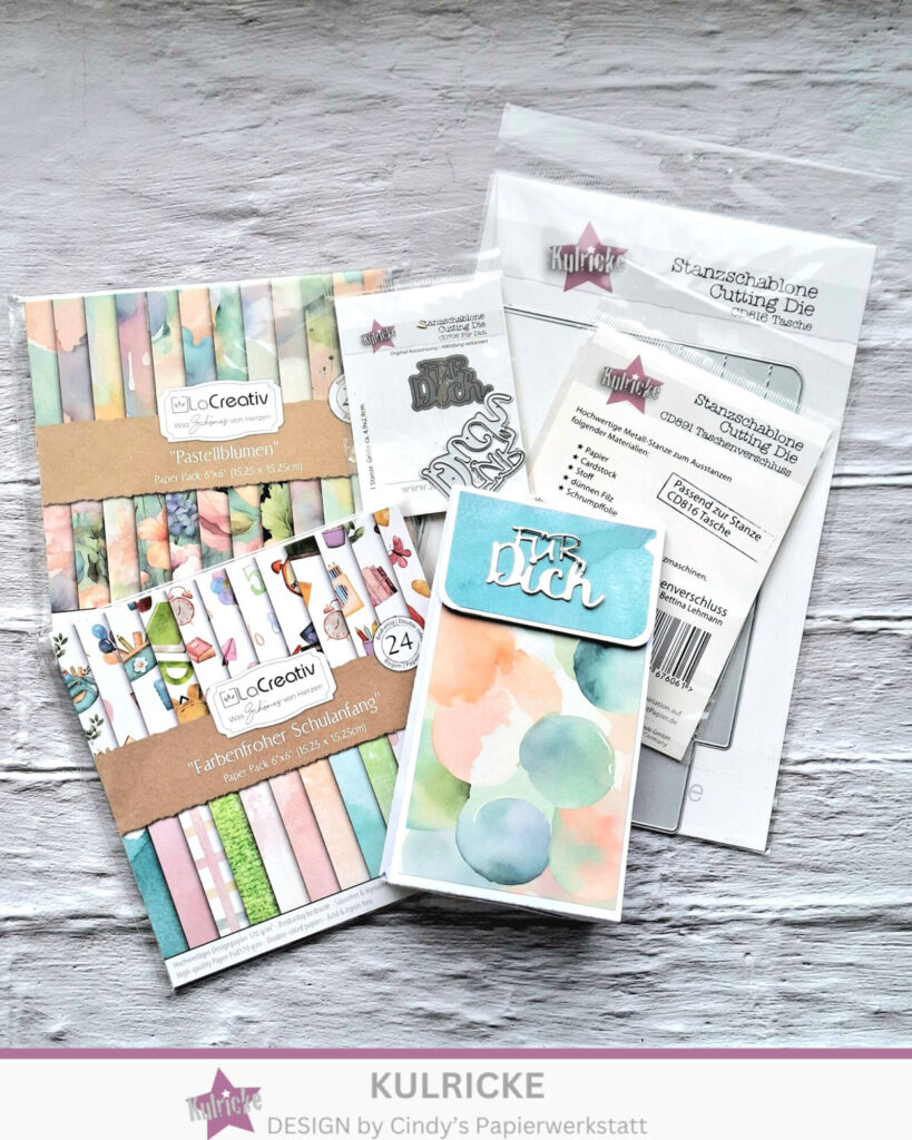 Mein Rohling der Tasche ließ sich wunderbar mit der Stanze anfertigen. Den großen Aufleger habe ich mir passend für Kulricke Stanzschablone „Tasche“ mit dem traumhaften LaCreativ – Designpapier „Pastellblumen“ für den Kulricke Stanzschablone „Taschenverschluss“ habe ich einen farblich passenden Bogen aus dem vielseitigen LaCreativ – Designpapier „Farbenfroher Schulanfang“ gewählt, zugeschnitten und Ecken abgerundet. Komplett wird die Tasche mit Kulricke Stanzschablone „Für Dich“ Die fertige Tasche hat die Maße von 9x16x3,8cm dieses bietet viele Gestaltungsmöglichkeiten.