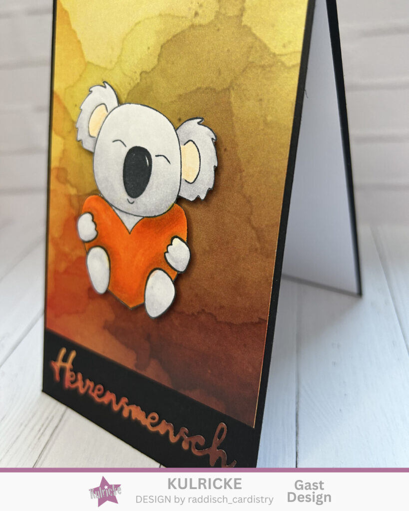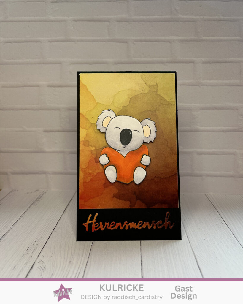 Diese selbstgebastelte „Herzensmensch“-Karte bringt mit ihrem leuchtenden Hintergrund und dem knuddeligen Koala ganz viel Wärme ins Herz.