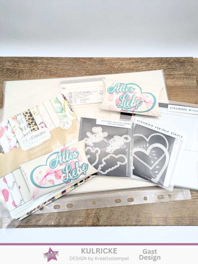 Anschließend könnt ihr die Box vor dem Zusammenkleben verzieren. Das habe ich mit der Stanzform Herz Duo gemacht und aus dem Designerpapier Mamaherz die beiden Herzen ausgestanzt. Mit dem Schriftzug Alles Liebe mit Schatten habe ich einen Text hinzugefügt. Hier könntet ihr auch ohne den Schatten arbeiten.