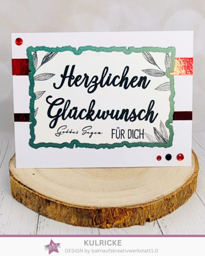 Dazu kommt eine passende Karte. Grundkarte 14×21 cm, lange Seite falzen bei 10,5 Cm. Darauf kommen die Bütten Aufleger. Der helle Aufleger wird mit den Blumen/ Blätter bestempelt und dem Herzlichen Glückwunsch. Fertig ist euer individuelles Geschenk Set.