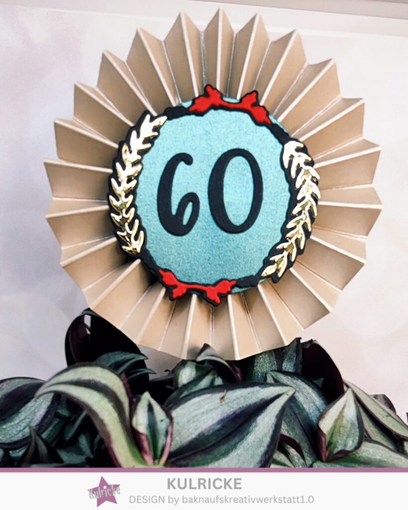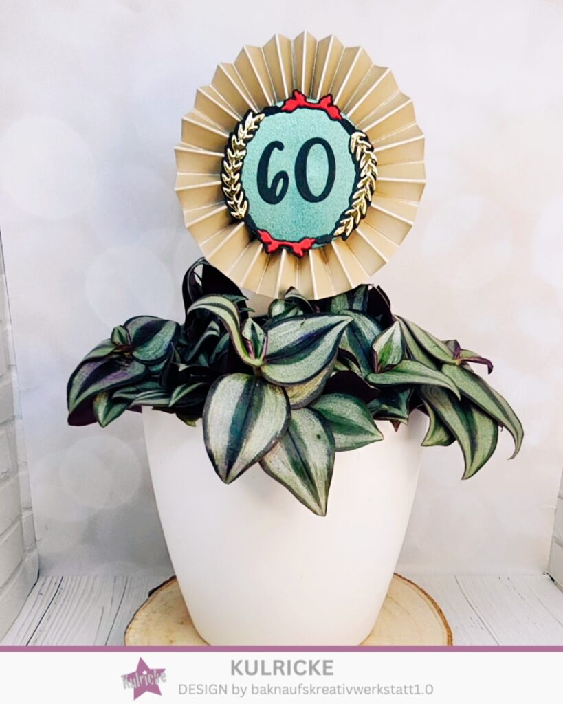 Für die Rosette braucht ihr einen langen oder zwei kürzere Streifen Cardstock. Dieser wird in 1 cm Abständen gefalzt und als Ziehharmonika gefaltet und das Ende wird zusammen geklebt. Ein Teil wird so zusammen gedrückt, so das eine Rosette entsteht, das in der Mitte mit Heißkleber fixieren. Darauf kommt ein Kreis und dieser wird mit Stanzteilen aus dem Jubiläum Set dekoriert. Darunter habe ich einen Stab geklebt um die Rosette in die Blume stecken zu können.