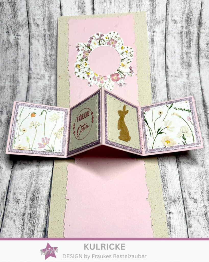 Innen poppt der schöne Effekt auf. Für die kleinen Felder habe ich außen das Designpapier „Zarte Frühlingsblumen“ verwendet. Der Stempel ist aus dem Set „Osterlichter“. Der kleine Hase, ist das Innenteil von dem Bild außen.