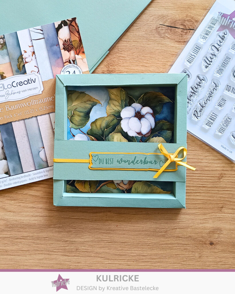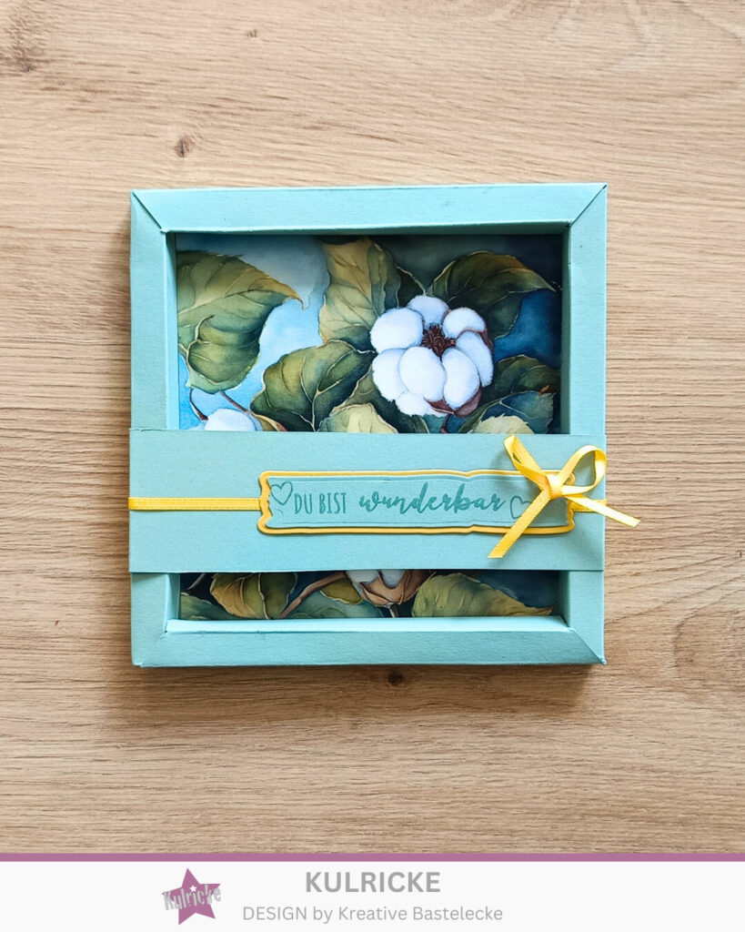 Auf dem Banner noch das „Du bist wunderbar“ gestempelt. Hierfür habe ich das Stempelset Fantastischer Geburtstag hergenommen. Damit es weiterhin Ton in Ton ist, habe ich hierfür auch das passende Stempelkissen verwendet und zwar das Ink-Pad – Stempelkissen Eukalyptus. Alles zusammengefügt, ergab es dann diese Shadowbox. Wie gefällt sie euch? In dem Sinne meine Lieben, traut euch kreativ zu sein.
