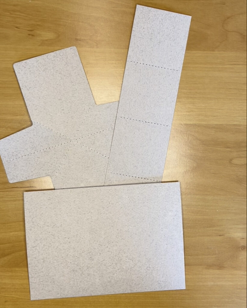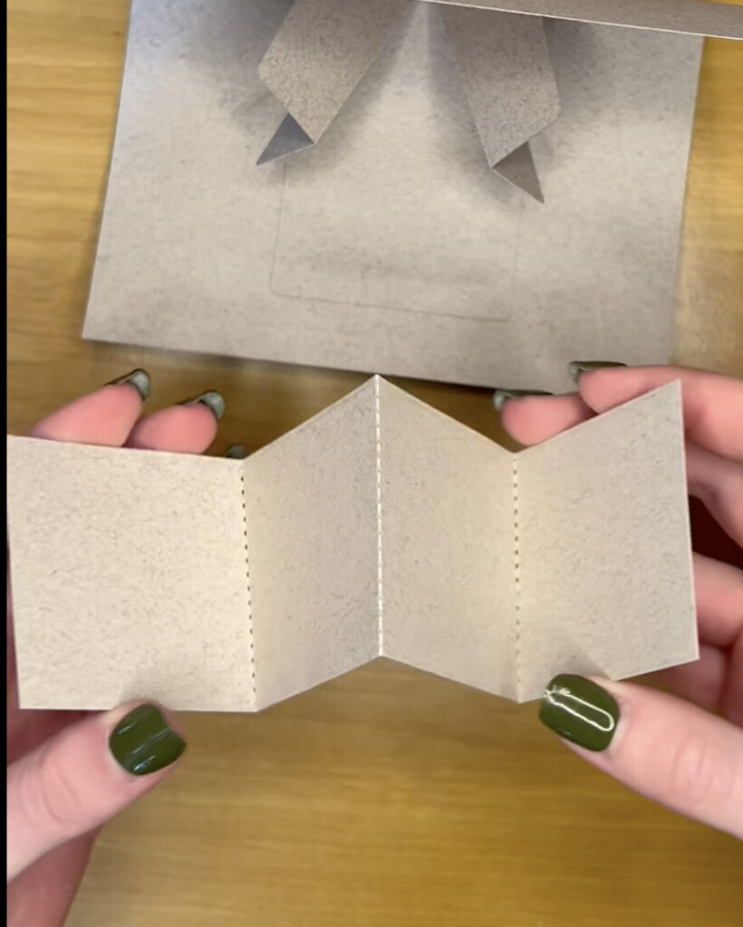 4. Als nächstes kommen wir zu dem langen ausgestanzten Streifen. Dieser wird auch entlang der Faltlinien, wie eine Ziehharmonika genickt, sodass ein W entsteht. Im weiteren verlauf muss beim Einkleben auch darauf geachtet werden, dass die Seitenenden nach oben gerichtet bleiben.