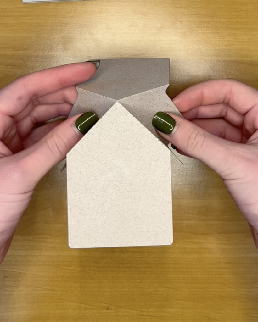 2. Nach dem Ausstanzen geht es gleich zum Falten. Zuerst bei dem große Kreuz alle Faltlinien einmal falten. Dann werden, wie im Bild links, die Seitenteile nach unten gefallen, sodass ein kleines „Haus“ entsteht. Nach dem Falten sollte es wie im Bild rechts aussehen.