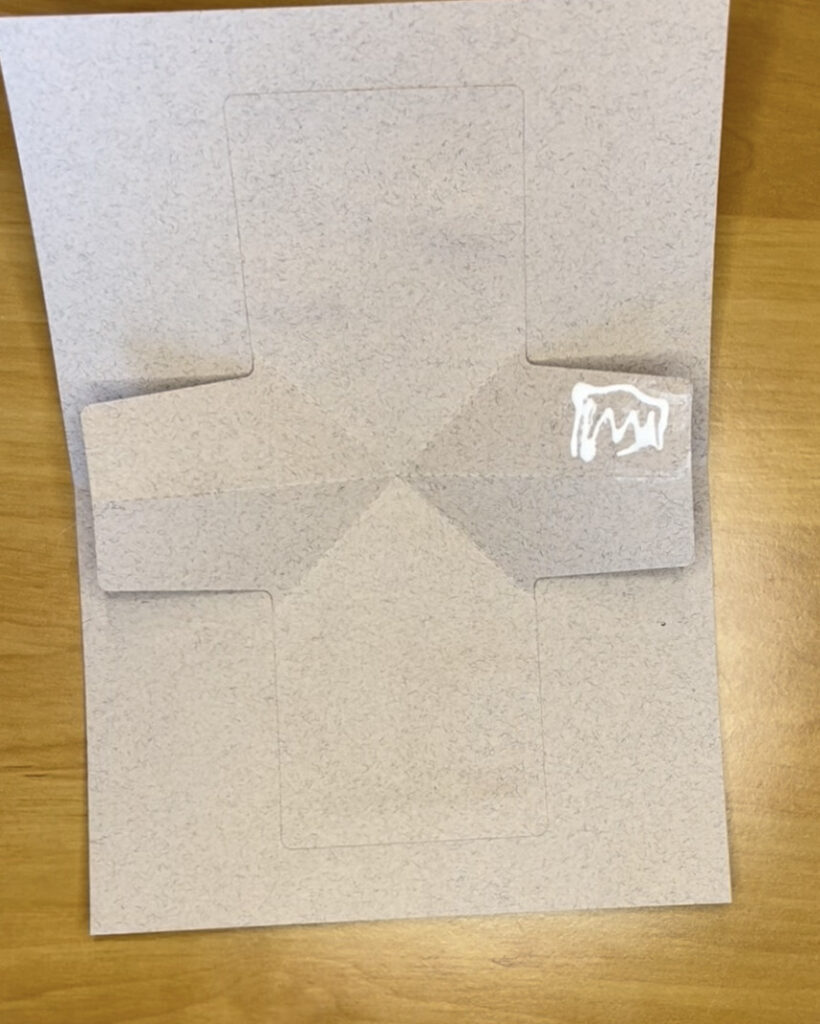 5. Danach kommt es zum Einkleben und dem etwas kniffligeren Part. Zuerst wird Kleber auf die rechte obere Seitenlasche gegeben. Wichtig dabei ist, dass der Kleber wirklich nur bis zur mittleren Falzlinie platziert wird, sonst klappt der Mechanismus am Ende nicht. Danach klebt ihr die rechte Seite der Ziehharmonika so auf, dass die linke Kante des Vierecks in Verlängerung der Außenkante des mittleren Kreuzes ist.