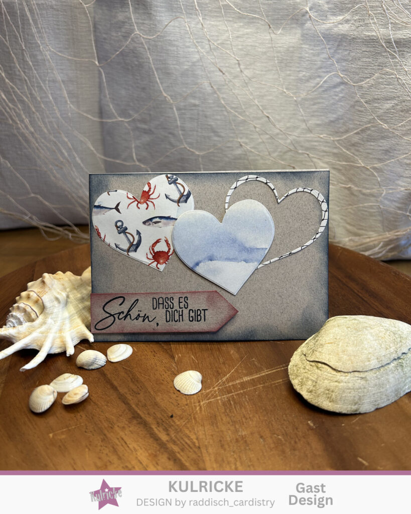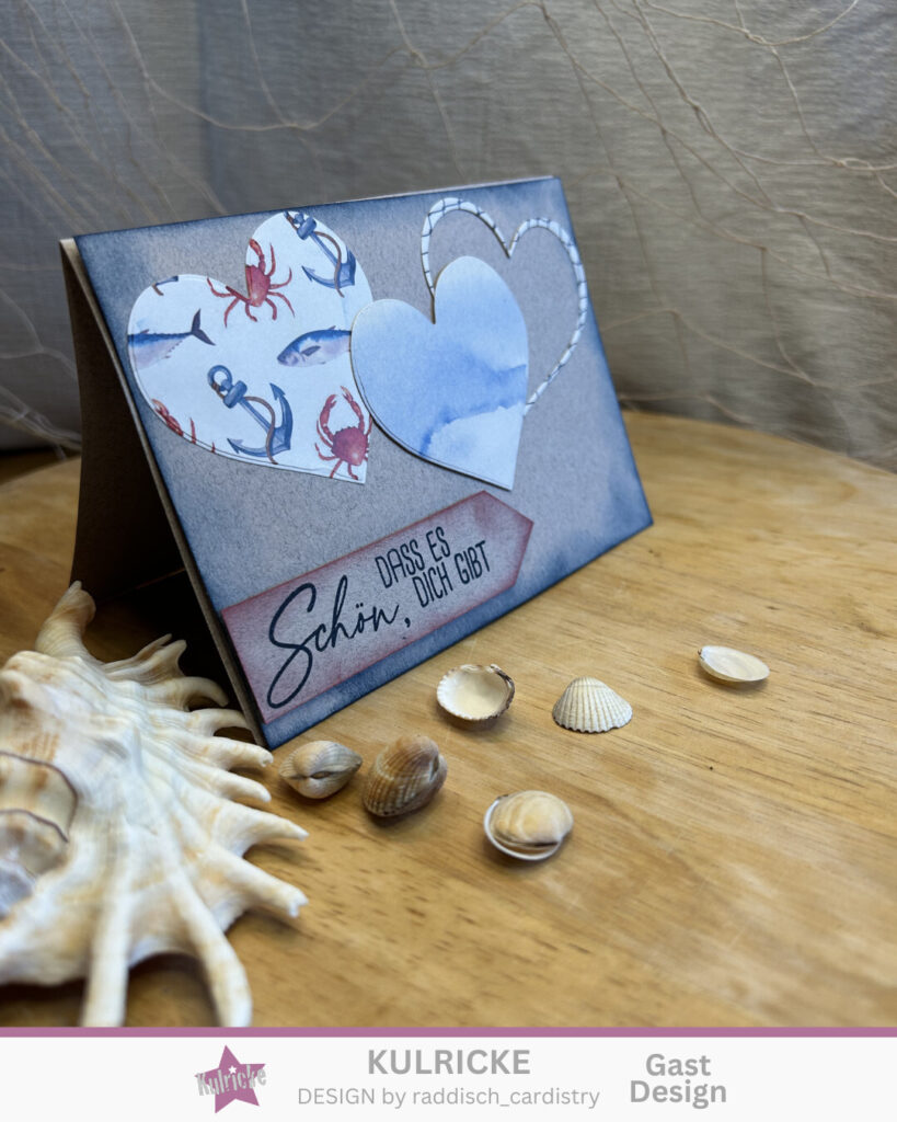 Die Herzen auf der Vorderseite habe ich aus dem selben Designpapier wie innen mit der Stanze „Herz Duo“ ausgestanzt.